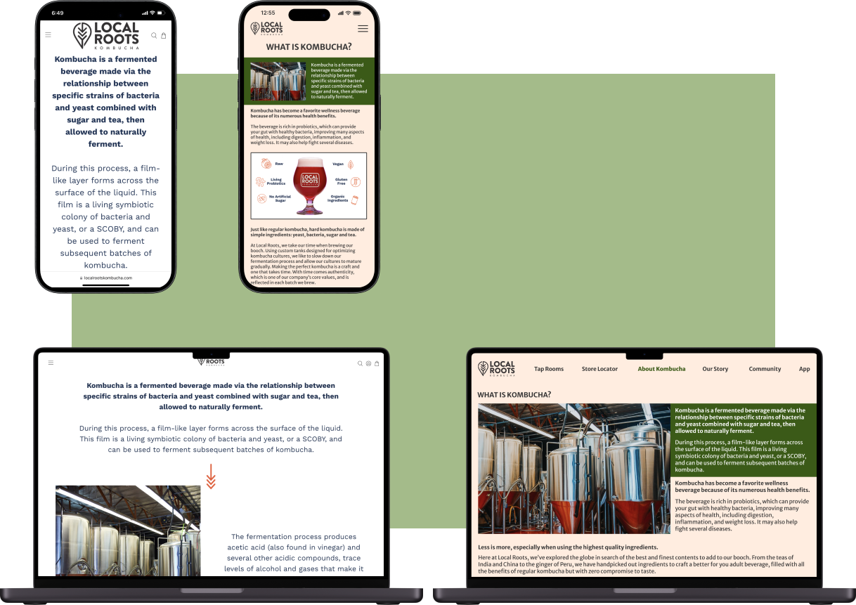 Differentiating yourself from your competitors when you offer a similar product can be very difficult, so finding out that something your company values is something the market is missing in terms of representation is gold. Creating this natural, fresh, local community driven design will help users connect more deeply with Local Roots and ensure they are on the right path as the kombucha market continues to grow.