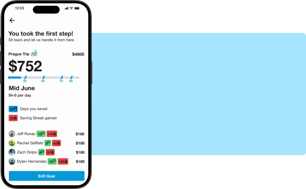 Not only is saving to go on a trip with your friends fun, it is proven to be more effective. Committing to a goal with another person increases the likelihood of that goal being achieved by 65%.
