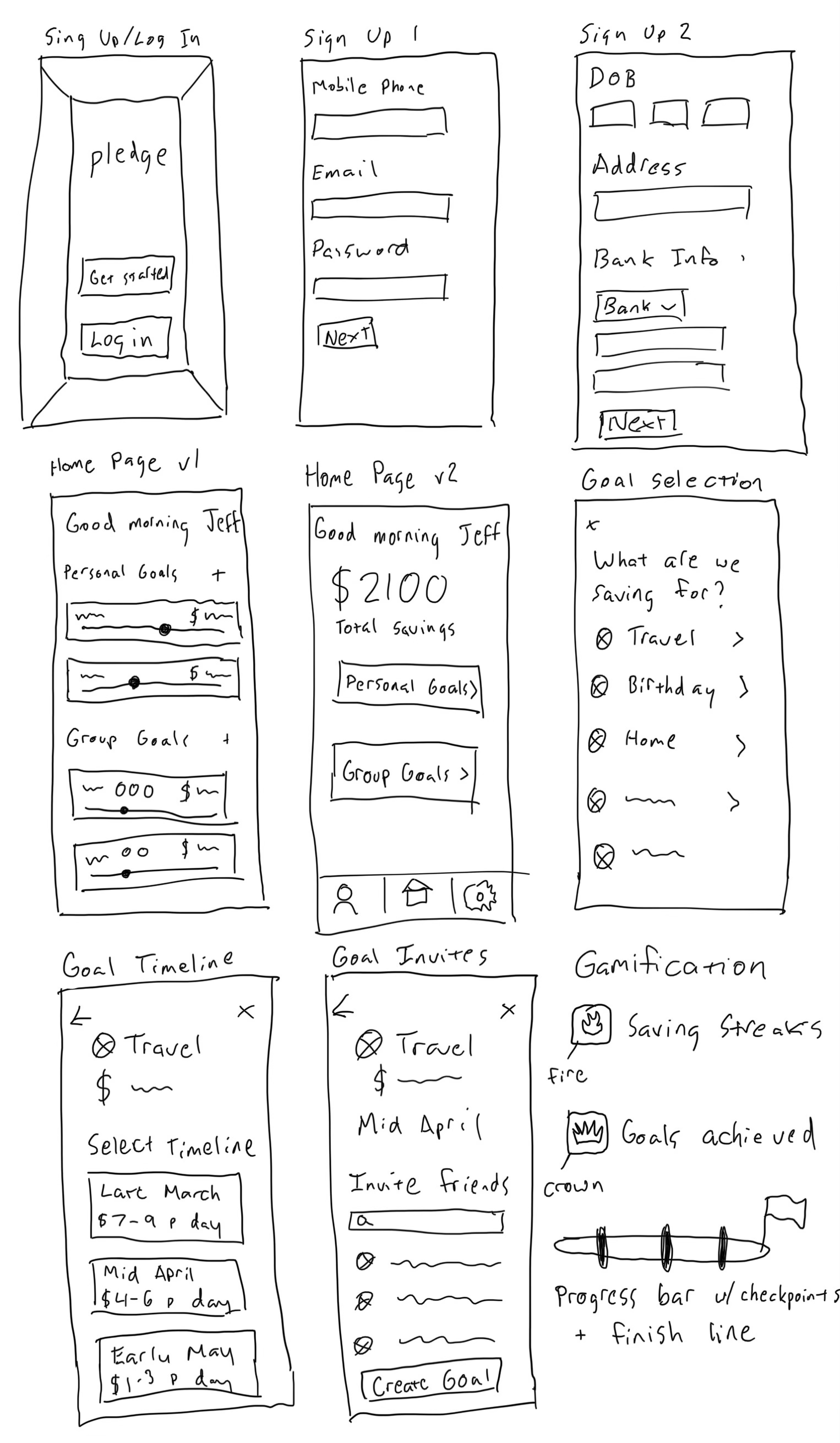 Creating wireframes for the user along different periods in the savings journey helped to gauge what functions and features were necessary for every step of the way. Ensuring that the gaming features felt both intuitive and rewarding was made much easier by designing for every step of that savings process.
