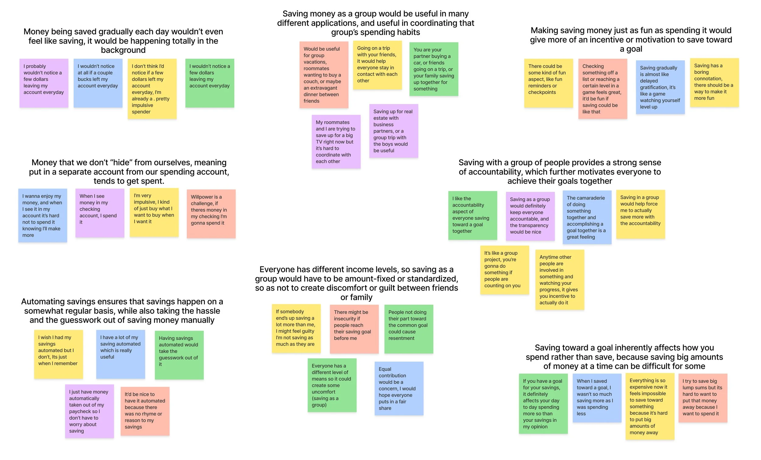 I found this project enriching because of how the problem applied to nearly everyone. Saving money is a universal issue, so unpacking that broad issue into a more refined problem that could be fixed more easily was extremely rewarding. Coming up with “game-like” features was very exciting and forced me to think about the concept of saving from a novel, unique perspective.